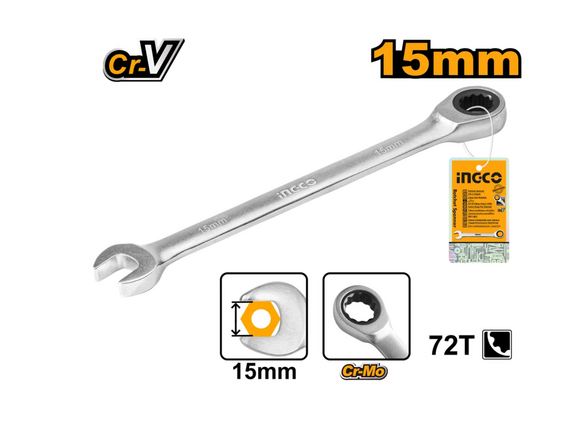 Ключ комбинированный INGCO INDUSTRIAL трещоточный 15 мм CrV (10/60)