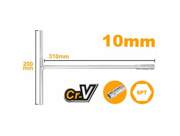 Торцевой ключ INGCO INDUSTRIAL с Т-образной ручкой, 10 мм HTSW1008 применяется для работ с резьбовыми элементами. Благодаря различной длине сторон ключ можно использовать для заглубленных или тугих болтов. Инструмент выполнен из высокопрочной хромованадиевой стали, благодаря чему отличается долговечностью и надежностью. Размер инструмента: 310х200 мм.
