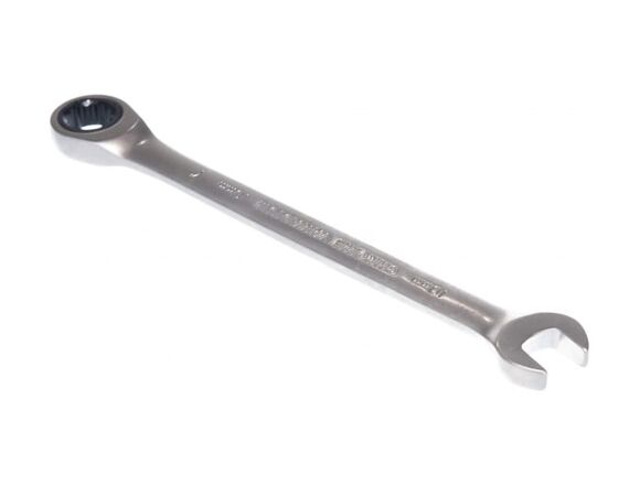 Комбинированный трещоточный ключ из хромованадиевой стали с надёжным 90-зубцовым храповым механизмом в накидной части. Ключ трещоточный ускоряет отворачивание и заворачивание крепежа как в обычных условиях, так и в условиях ограниченного пространства. Обеспечивает высокий крутящий момент и минимальный угол возврата — 4º.Трещоточная часть ключа не предназначена для срыва и силовой протяжки крепежа, для этого применяется рожковый профиль ключа или торцевые головки.Размер: 10 ммДлина: 160 ммСталь: 6140CrVТвёрдость: 44—48 HRCНикелирование