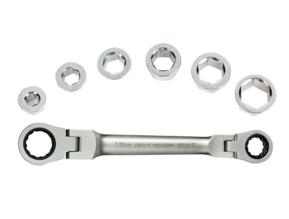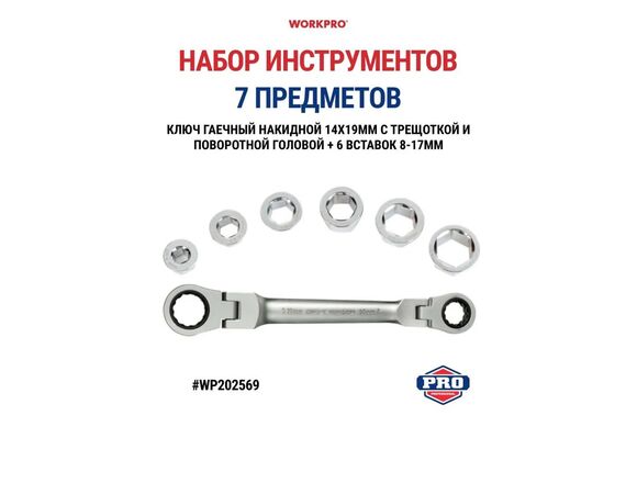 Ключ накидной с трещоткой и поворотной головкой WORKPRO вставки 7шт 8/10/12/13/15/17мм(1/48)