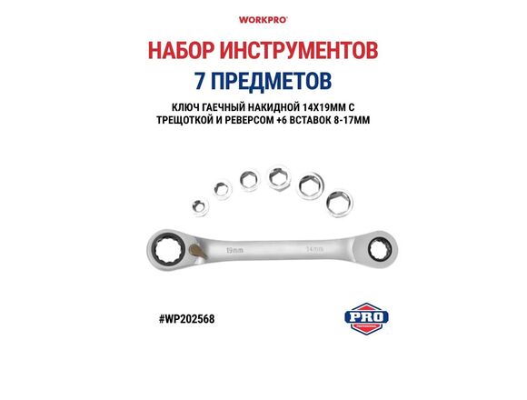 Ключ накидной с трещоткой и реверсом WORKPRO вставки 7шт 8/10/12/13/15/17мм (1/48)