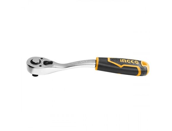 Ключ трещоточный изогнутый 1/2" HRTH8412 INDUSTRIAL с двухкомпонентной изогнутой ручкой используется для работы с крепежом различной сложности, простой и удобный ручной инструмент для работы с резьбовыми соединениями.Конструкция изготовлена из хромованадиевой стали с хромомолибденовым покрытием, которая отличается повышенной твердостью.Кнопка быстрого сброса;Переключатель направления вращения.