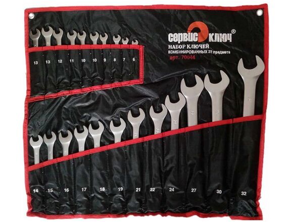 Набор ключей 22 предмета сумка СЕРВИС КЛЮЧ 6-19, 21,22,24,27,30,32 70044 представляет собой комплект инструмента, при помощи которого можно без труда работать с типовыми размерами шестигранного крепежа.
