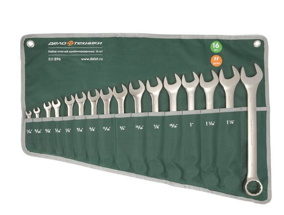Набор комбинированных дюймовых ключей 16 шт Дело Техники 511896 подходит для работы с крепежом, в том числе при большом усилии. Специальное покрытие позволяет защитить инструмент от влаги. Это сохраняет общую прочность инструмента.Метод изготовления не воздействует на структуру металла, поэтому в инструменте нет слабых мест. Этим обеспечивается одинаковая прочность во всех частях ключей.