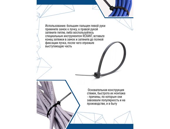 Нейлоновые стяжки vertextools 5х250, черный, 100 шт. СНЧ-5-250 - неразъемные, предназначены для крепления электрокабеля, других хозяйственных и строительных нужд. Обладают следующими характеристиками:
