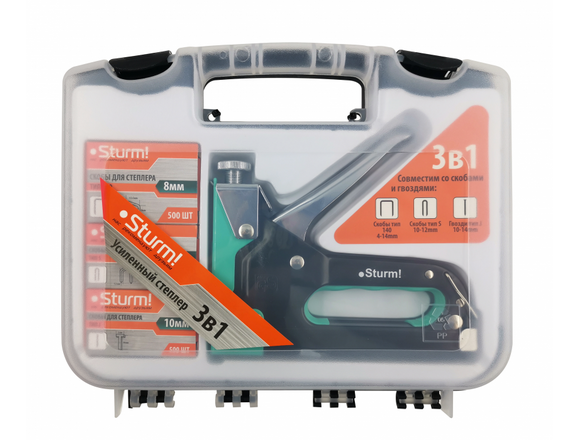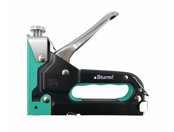 Корпус степлера в кейсе Sturm 1071-01-S1 изготовлен из металла с электростатическим покрытием, которое обеспечивает долговечность конструкции.