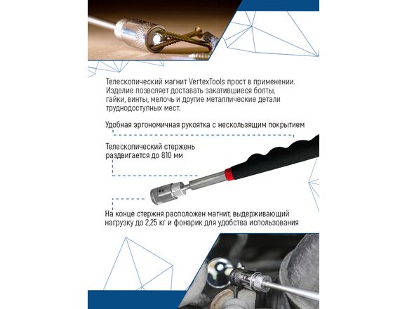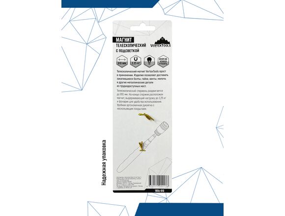 Телескопический магнит vertextools 810 мм, с подсветкой 1806-810 прост в применении. Изделие позволяет доставать закатившееся болты, гайки, винты, мелочь и другие металлические детали из труднодоступных мест.