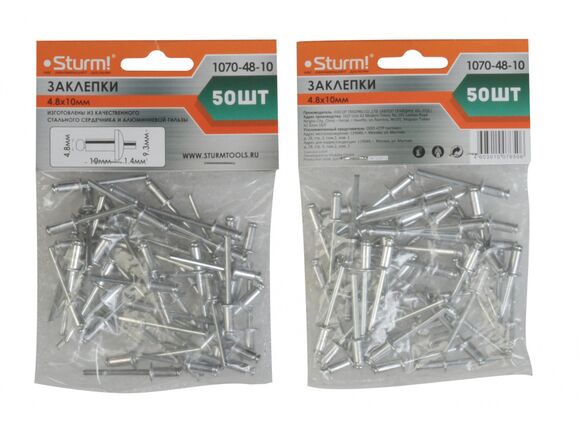 Заклепки алюминий/сталь Sturm 1070-48-10 предназначены для заклепочников. Применяются для соединения листовых материалов между собой. Устанавливаются в отверстие, после чего расклепываются со стороны стержня, образуя прочное соединение. Стержень изготовлен из стали, заклепка из алюминия.