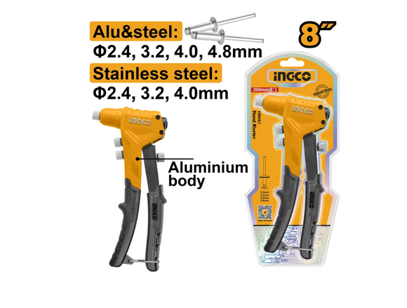 Заклепочник INGCO 200 мм HR081 используется для клепания стальных и алюминиевых заклепок разных размеров. Модель изготовлена из высокопрочной стали и алюминия и имеет долгий срок службы. Головка снабжена сменными насадками, которые идут в комплект и крепятся на инструменте.