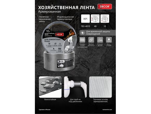 Скотч армированный серый ТПЛ DЕCOR 48мм*10м (1/54)