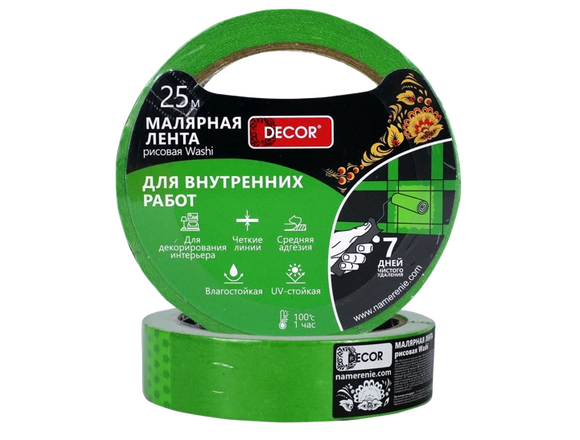 Лента малярная зеленая DЕCOR 25мм*25м, для внутренних работ (1/99)