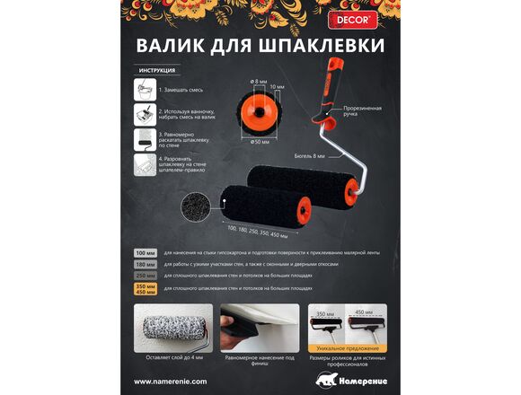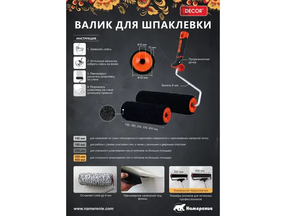 Валик для нанесения шпаклевки DECOR 250мм,бюгель 8мм, Ø50мм, ворс 10мм (20/40)