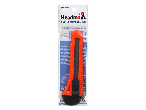 Универсальный пластиковый нож HEADMAN с сегментированным лезвием 18мм квадратный фиксатор 685-009 подойдет для резки плотных напольных покрытий и других аналогичных материалов. Конструкция включает в себя стальные направляющие.
