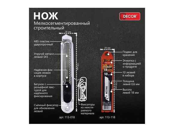 Нож с сегментным лезвием DECOR 18мм, 0,6мм, мелкосегментированный (10шт/120шт)