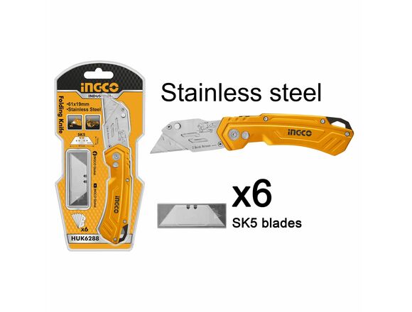 Складной универсальный нож INGCO SK5 INDUSTRIAL HUK6288 - это универсальный инструмент, имеющий широкую сферу применения. С его помощью можно быстро и аккуратно разрезать такие материалы, как картон, изоляция, дерево, сайдинг, ковровые покрытия, гипсокартон, пластик.