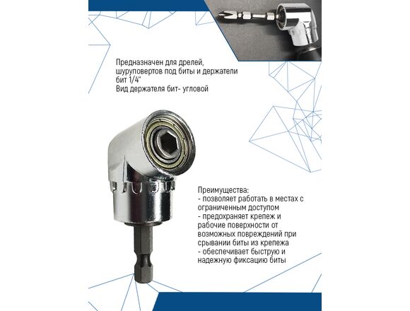 Редуктор для бит угловой (1/4"; 61 мм) Vertextools РД-1/4-61 обеспечивает профессиональное и комфортное выполнение монтажных работ. Предназначен для дрелей, шуруповертов под биты и держатели бит 1/4. Корпус насадки изготовлен из прочной и высококачественной стали.Позволяет работать в местах с ограниченным доступом.Предохраняет крепеж и рабочие поверхности от возможных повреждений при срывании биты из крепежа.