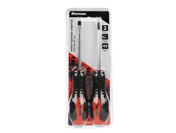 Набор ударных отверток 2 шт, PH2x100, SL6x100 ЕРМАК 651-221 имеет высокую прочность за счет качественного соединения стержня и рукоятки. Легко держать в руках.