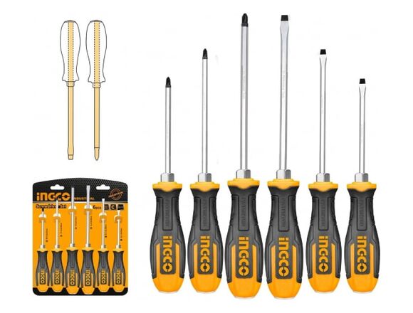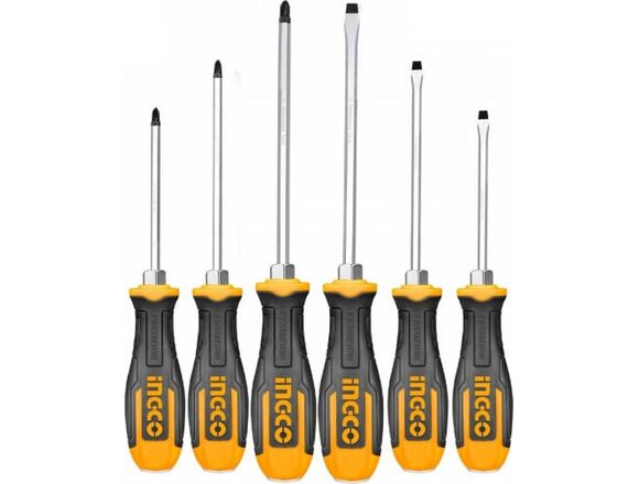 Набор ударных отверток 6 шт. INGCO HSGT680608 подходит для сложного крепежа. Инструмент можно использовать при демонтаже ржавых и прикипевших болтов.На тыльной стороне имеется защитная пластина из металла. Позволяет безопасно бить молотком с большим усилием.Жало выполнено из закаленной стали и имеет магнитный наконечник.Цельнометаллические стержни проходят полностью сквозь все тело рукояток.Рукоятки выполнены из двухкомпонентного материала что позволяет надежно фиксировать отвертки в руке.