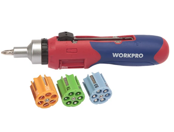 Реверсивная отвертка с храповым механизмом и автоматической сменой бит WORKPRO 24 насадки WP221056 поставляется с высокопрочными битами, которые обеспечивают стабильную работу с крепежом. Инструмент можно использовать в бытовых условиях, а также для ремонта.