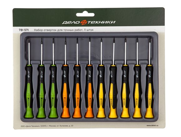 Набор отверток для точных работ 11 шт Дело Техники 781571 подходит для электронщиков. Длинная рукоять и точная обработка наконечников стержней значительно упрощает работу.