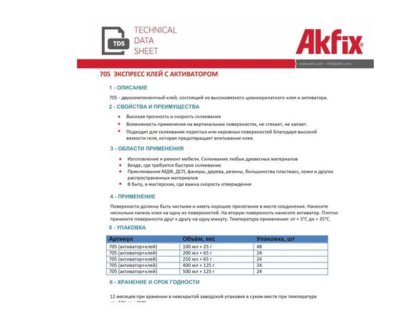 Набор для экспресс склеивания Akfix 705 представляет собой высококачественный, высокоэффективный, универсальный двухкомпонентный цианакрилатный клей нового поколения с активатором в аэрозольном баллоне. Комплект состоит из вязкого геля цианакрилата и аэрозоля активатора. Двухкомпонентный клей на цианакрилатной основе применяется для быстрого и надежного склеивания деталей и элементов массивной древесины или фанеры, а также синтетических материалов (МДФ, ДСП, ПВХ, резины и т.п.). Клей Akfix 705 обладает великолепными техническими характеристиками при склеивании различных видов материалов, характеризуется очень быстрым и прочным склеиванием, устойчивостью к перепадам температуры и действию влаги.