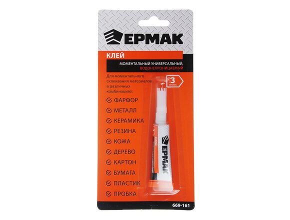 Моментальный универсальный, водонепроницаемый клей. Используется для моментального склеивания материалов в различных комбинациях: фарфор, металл, керамика, резина, кожа, дерево, картон, бумага, пластик, пробка.