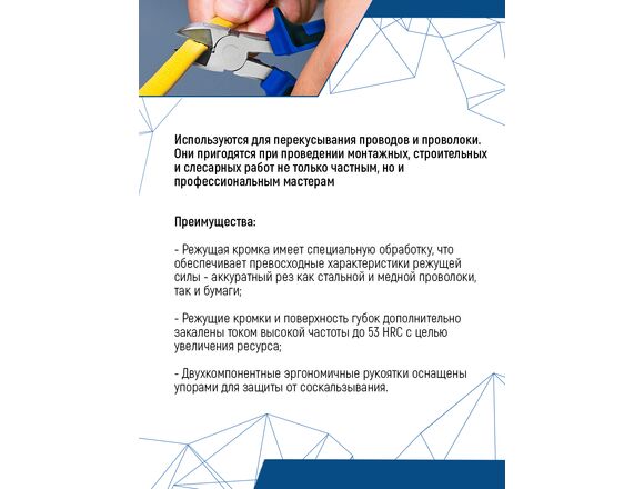 Бокорезы vertextools ПРОФИ 180ММ 0036-180 переназначены для резки провода из меди, алюминия и других цветных металлов, для выполнения небольших резов металла, пластмассы. Инструмент позволяет перерезать провода различного, в основном небольшого диаметра.Рабочие кромки изготовлены из стали твердостью 53HRC, что гарантирует прочность и долгий срок службы. Двухкомпонентные рукоятки эргономичной формы обеспечивают удобство в работе с инструментом.Сатинированное покрытие рабочих поверхностей инструмента увеличивает износостойкость материала и препятствует образованию коррозии.