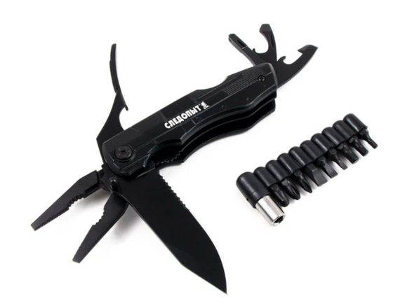 В состав мультитула входят следующие инструменты: тонконосые плоскогубцы, плоскогубцы, резак для проволоки, нож с серейтором, консервный нож, открывашка для бутылок, плоская отвертка, квадратная отвертка, набор бит - 10 шт (переходник с магнитом и 9 бит: шестигранники HEX 3,4,5 мм, прямая отвертка 0,6х3 мм, прямые отвертки 3,5,7 мм, крестовая отвертка PH1, PH2, PH3).