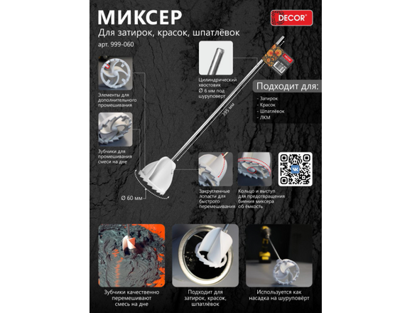 Венчик для ДРЕЛИ DECOR Ø60*395мм, для краски/затирки/шпатлевки СПЕЦФОРМА (20/80)