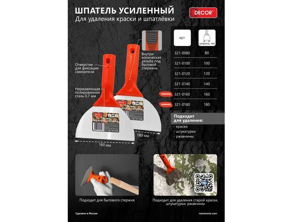 Шпатель-скребок DЕCOR 180 мм, 0,7 мм, НЕРЖ конич. резьба (18шт/90шт)