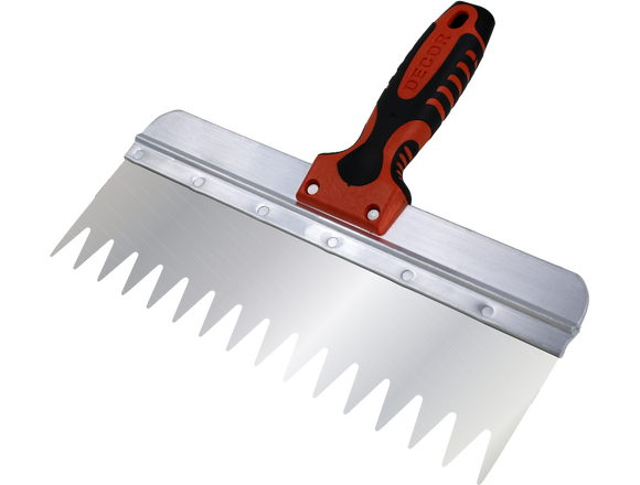 Шпатель зубчатый широкий DECOR PROFI 250мм, зуб ТРЕУГОЛЬНЫЙ 20*27мм, нержсталь, 2К ручка (12/60)