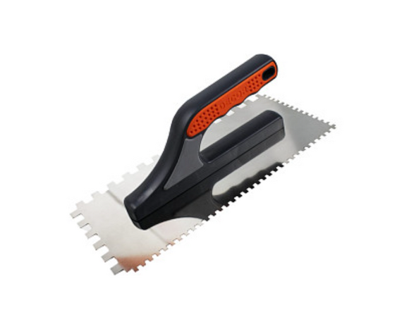 Гладилка для нанесения и распределения клея для плитки, кафеля и керамогранитаУдобная прорезиненная ручка облегчает работу с раствором
