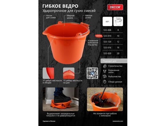 Ведро строительное DECOR PROFI "ОРАНЖ" 10л, ударопрочное (1/15)