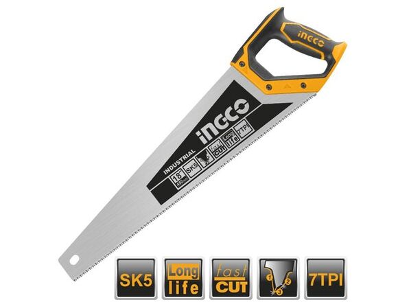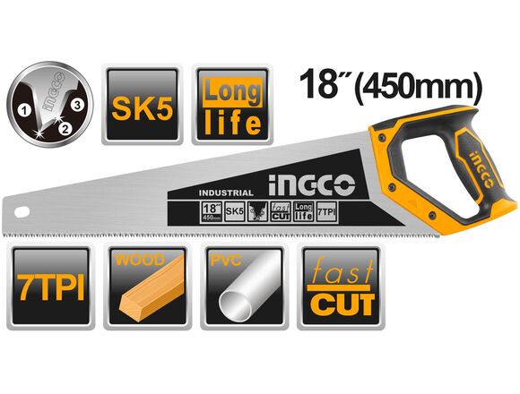 Ножовка по дереву INGCO INDUSTRIAL 450 мм HHAS28450 используется для распила изделий из древесины. Пильное полотно выполнено из углеродистой стали марки SK5, которая известна благодаря своей прочности и хорошо держит заточку. Тройная заточка зубьев обеспечивает качественный рез заготовки.