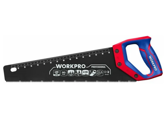 Ножовка по дереву WORKPRO c тефлоновым покрытием, 400 мм, SK5 WP215013 подходит для быстрой резки дерева, бамбука, ПВХ и других материалов. Эргономичная рукоятка обеспечивает надежный хват и комфортную эксплуатацию. Пильное полотно оснащено отметкой шкалы для удобства использования. Тройная заточка зубьев гарантирует чистый и точный рез. Конструкция больших и малых зубьев обеспечивает быстрое удаление стружки и повышает эффективности распила.