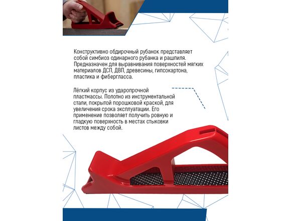 Конструктивно обдирный рубанок представляет собой симбиоз одинарного рубанка и рашпиля. Предназначен для выравнивания поверхностей мягких материалов ДСП, ДВП, древесины, гипсокартона, пластика и фибергласа.