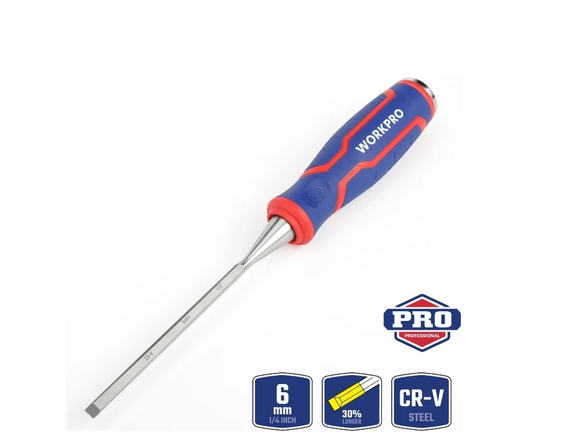 Стамеска-долото представляет собой столярный ручной режущий инструмент, предназначенный для выборки небольших углублений в древесине, зачистки пазов, снятия фасок, рельефной и контурной резьбы. Лезвие из кованой стали CR-V, выкованное методом капельной ковки, термообработанноеКромка лезвия заточена и на 30% длиннееСтальной приклад, рассчитанный на тяжелые ударыЭргономичная рукояткаШирина полотна: 6 мм