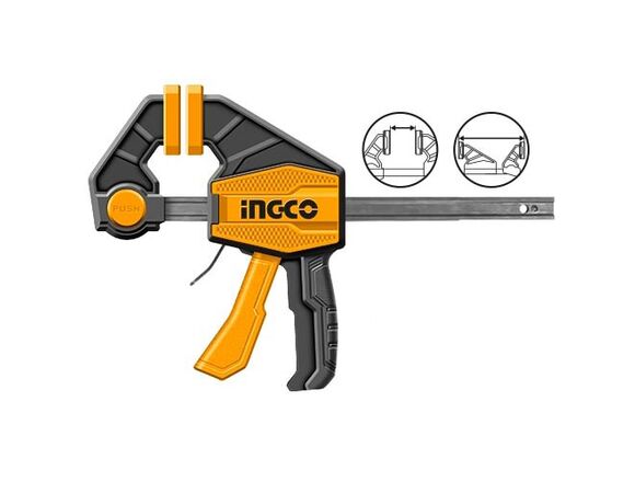 Быстрозажимная струбцина INGCO 63х450 мм HQBC01603 представляет собой удобное приспособление для фиксации заготовок. Опорная губка перемещается и фиксируется по всей длине направляющей при помощи рукоятки, а также может переставляться на другой конец направляющей, что позволяет использовать струбцину «на разжим».