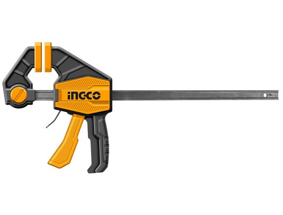 Быстрозажимная струбцина INGCO 80x450 мм HQBC18801 представляет собой удобное приспособление для фиксации заготовок. Опорная губка перемещается и фиксируется по всей длине направляющей при помощи рукоятки, а также может переставляться на другой конец направляющей, что позволяет использовать струбцину «на разжим».