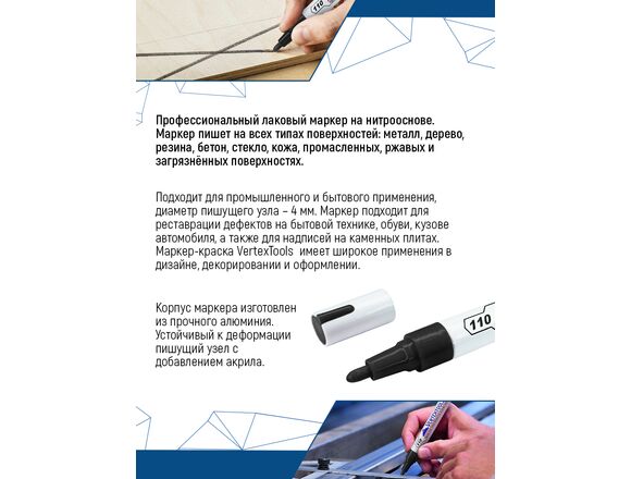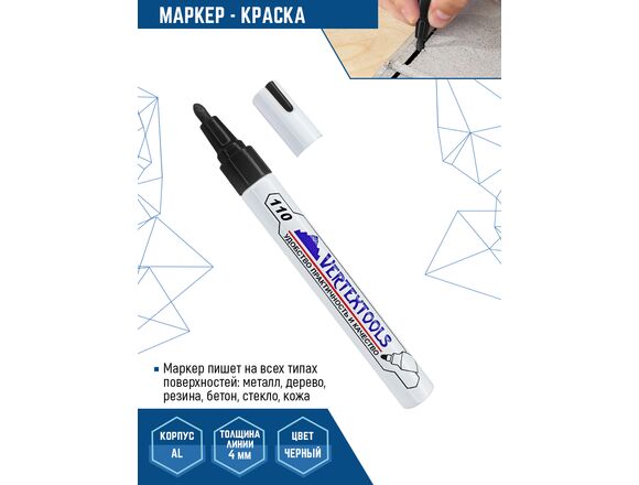 Строительный маркер-краска vertextools черный 0020-02 используется для нанесения надписей на стекло, металл, бетон, пластик, дерево, текстиль, резину, включая влажные, шершавые, масляные, пористые поверхности. Не выгорает на солнце. Краска устойчива к механическим воздействиям. Толщина линии - 4 мм.