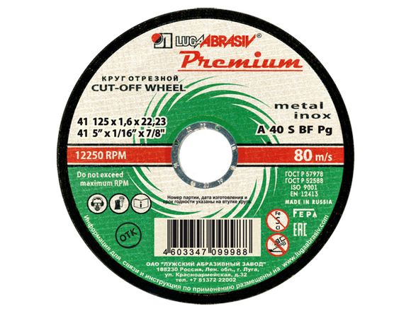 Круг отрезной по металлу + нерж ЛУГА PREMIUM 125 х 1,6 х 22,2мм, 1/400