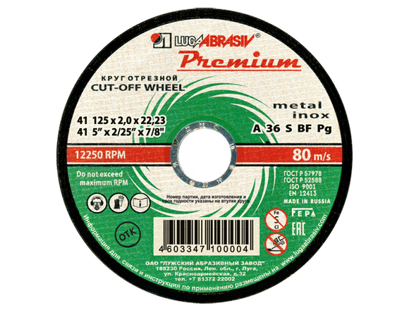 Круг отрезной по металлу + нерж ЛУГА PREMIUM 125 х 2,0 х 22,2мм, 1/200