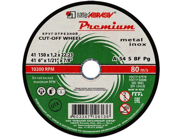Круг отрезной по металлу + нерж ЛУГА PREMIUM 150 х 1,2 х 22,2мм, 1/200