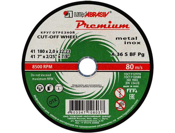 Круг отрезной по металлу + нерж ЛУГА PREMIUM 180 х 2,0 х 22,2мм, 1/150