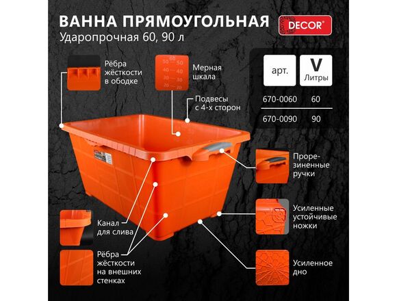 Таз строительный прямоугольный DECOR PROFI 60л ОРАНЖ, ударопрочный морозостойкий, ручки 2К (1/5)