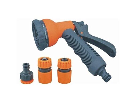 В наборе пистолет для полива выполнен из высокопрочного пластика. Ручка выполнена из мягкого пластика. Насадка имеет 8 режимов полива. Курок имеет фиксатор.