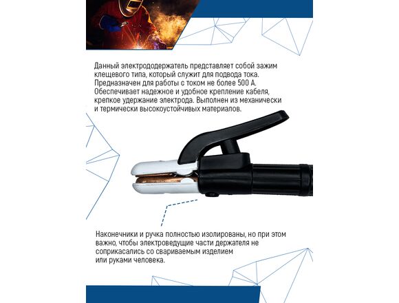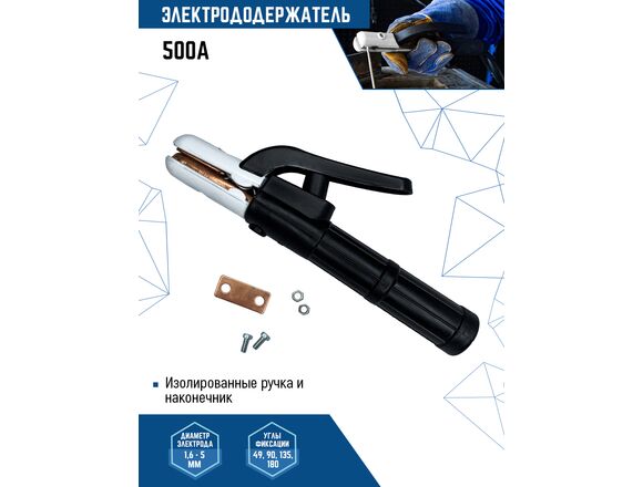 Электрододержатель 500А vertextools 0018-500 используется при сварочных работах. Представляет собой зажим клещевого типа, который служит для подвода тока. Данный электродержатель предназначен для работы с током не более 500 А. Пластиковые ручки являются изолятором, но при этом важно, чтобы электроведущие части держателя не соприкасались со свариваемым изделием или руками человека.