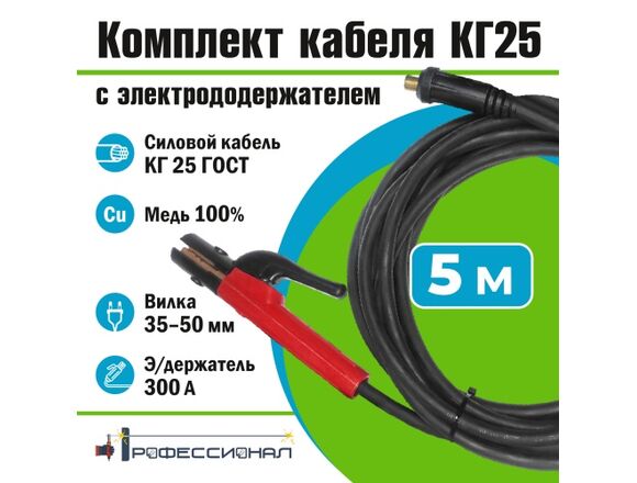 Комплект кабель ПРОФЕССИОНАЛ КГ 25 с электрододержателем 5м вилка 35-50
