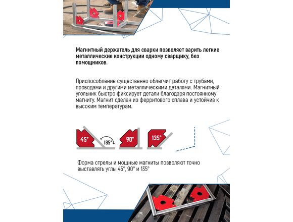 Магнитный уголок для сварки 45/90/135 градусов, 22.6 кг vertextools 45-90-135-22 - специальное приспособление (магнитная струбцина, сварочный магнит) для точной фиксации стальных деталей при сварке, пайке и других операциях по сборке металлоконструкций.