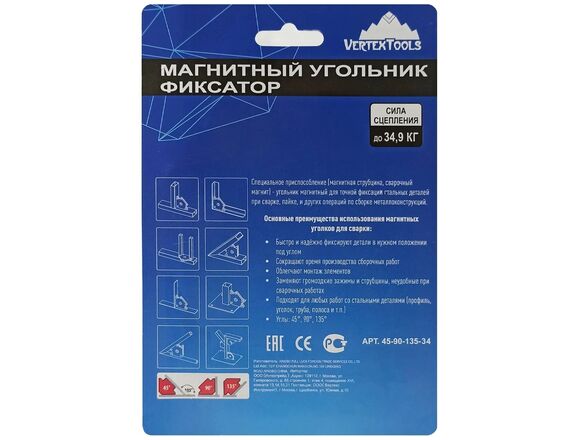 Магнитный уголок для сварки 45/90/135 градусов, 34.9 кг vertextools 45-90-135-34 - специальное приспособление (магнитная струбцина, сварочный магнит) для точной фиксации стальных деталей при сварке, пайке и других операциях по сборке металлоконструкций.